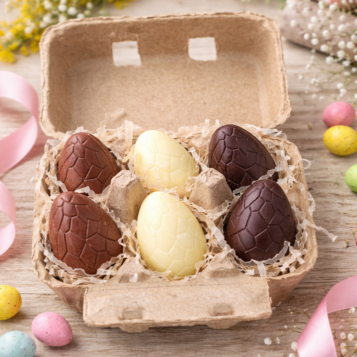 A refined selection of six handcrafted chocolate eggs, presented in a rustic tray and nestled in delicate paper shreds. Offering a balance of milk, dark, and white chocolate. Thoughtfully designed for both visual delight and rich flavour, this collection makes a charming Easter gift or an indulgent seasonal treat.