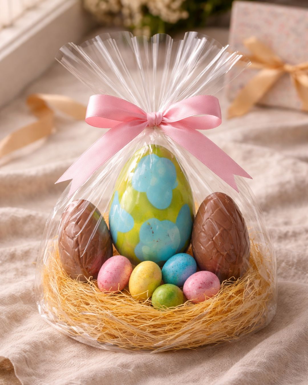 A beautifully curated Easter gift bundle featuring a striking large chocolate egg, complemented by two medium and five small eggs in a harmonious mix of milk, dark, and white chocolate. Each piece is carefully crafted and decorated with delicate patterns and soft pastel touches. Elegantly arranged in a nest-style base and wrapped in clear cellophane with a ribbon finish, this set is for gifting, sharing, or elevating your festive moment.