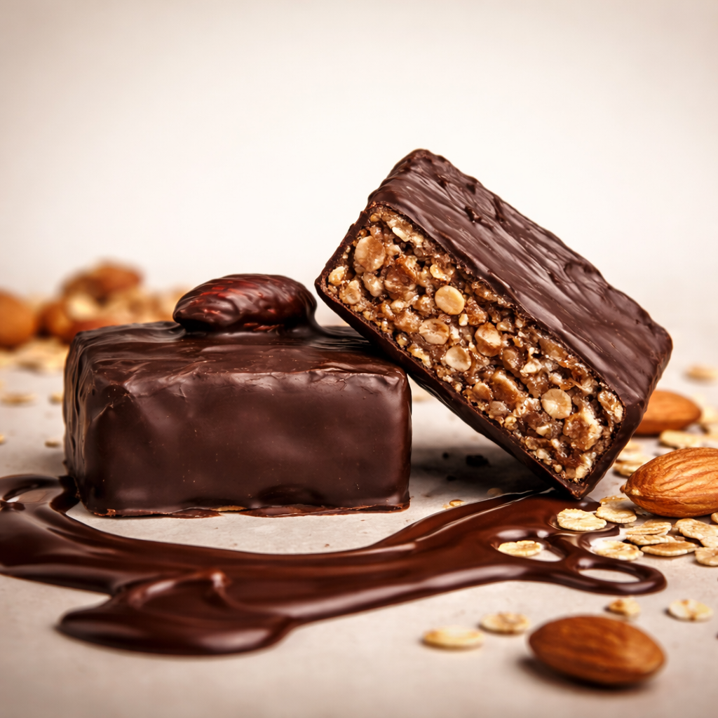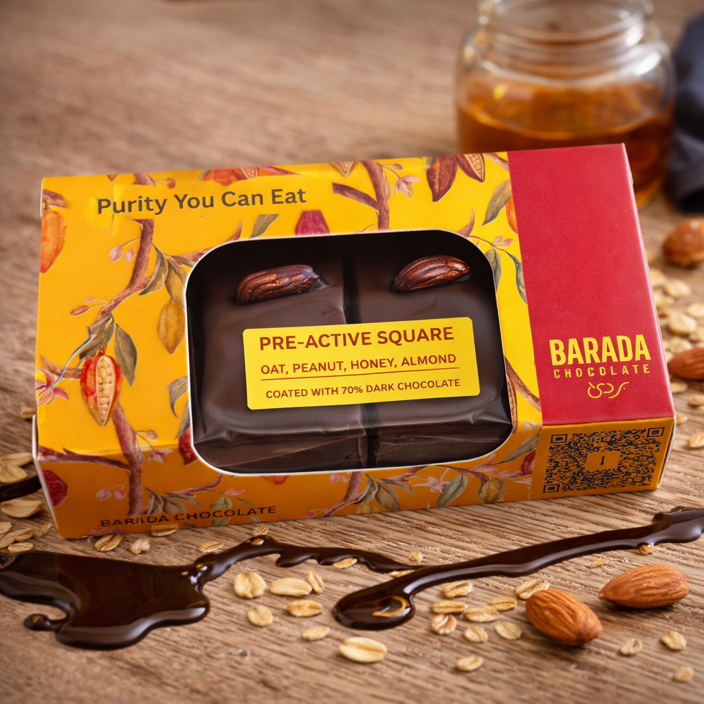 Fuel your body with our Pre-Active Square. A balanced blend of oats, peanuts, honey, coconut, and almonds, enrobed in rich 70% dark chocolate. Designed to deliver sustained, natural energy, it’s the ideal companion before any workout.